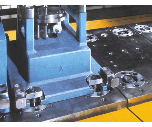 Swing sink clamping elements in a double-column press. The tie rod is extended (swing position). Die positioning is made by lateral stops. Easy feeding of dies by hydraulic roller bars installed in the T-slots.