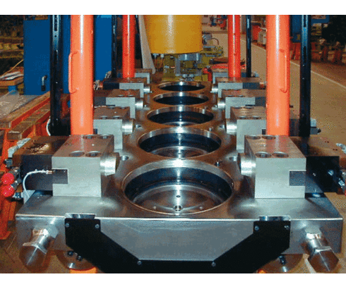 Wedge clamps with sequence valve control on a forging press.