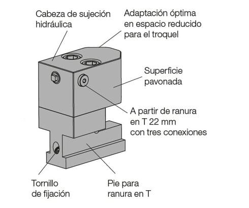 La cabeza compacta de sujeción por introducción es un elemento de sujeción hidráulico, utilizado en espacios reducidos para el blocaje y apriete en máquinas e instalaciones, tanto en la mesa inferior como en la mesa superior de la prensa.
